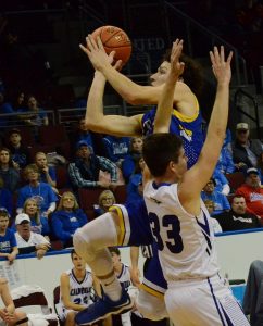 Lebo sophomore Devan McEwen (23) takes a running jump shot in the Wolves' March 7, 2019 1A State Basketball Tournament against the Osborne Bulldogs. SHELTON BURCH/GATEHOUSE KANSAS / Dodge City Daily Globe