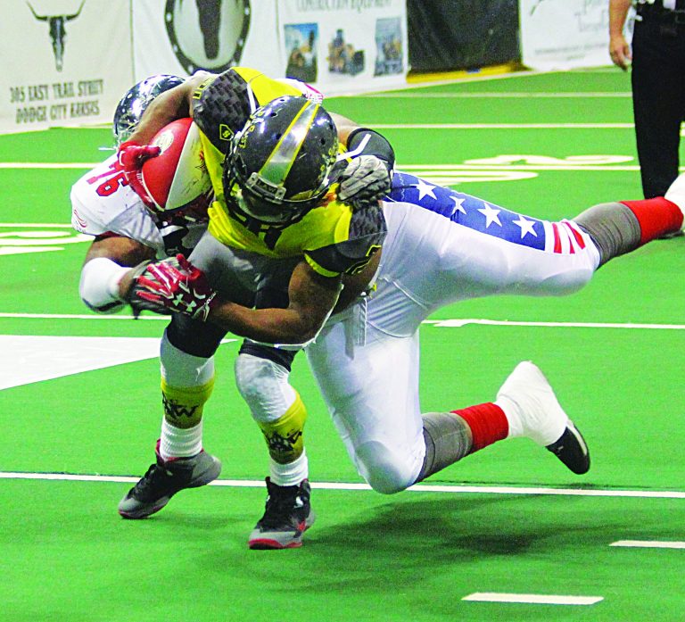 Dodge City Law running back Dominique Carson battles for extra yardage in the Law's 43-20 win over the Salina Liberty. FILE PHOTO / Dodge City Daily Globe