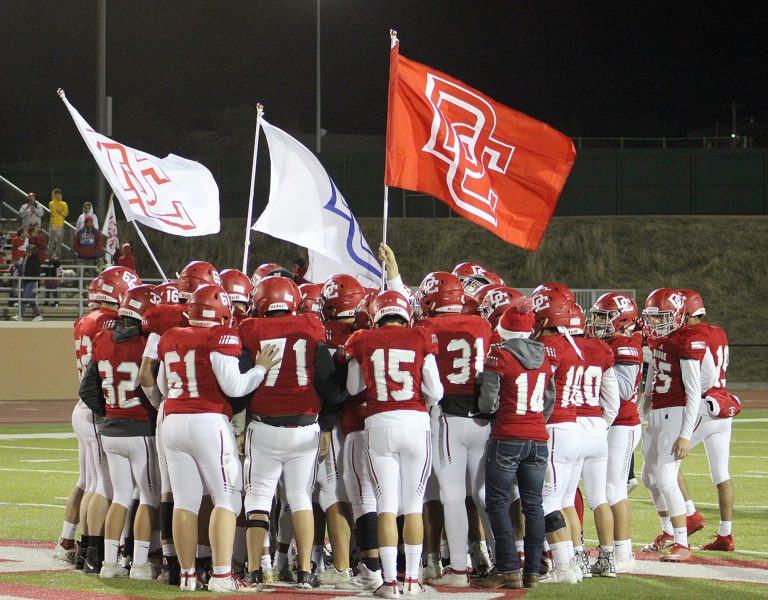 The Dodge City Red Demons have a team huddle, complete with flags, before the start of their game against Junction City. [SUBMITTED/ANNIE PETERS] / Dodge City Daily Globe