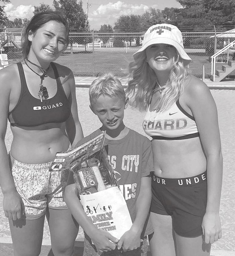 Family Outdoor Recreation sponsored a fireworks giveaway at five locations in honor of Independence Day, including Hodgeman County High School cheerleader’s stand and The Snow Cone Shop in Jetmore, A&A Fireworks in Dodge City and The Boom Box in Cimarron. Pictured here is the fireworks giveaway winner Grayson Herr with Spearville swimming pool lifeguards Kara Brakey and Kendall Ratzlaff.