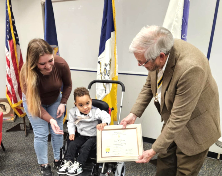 Sons of the Plains President Leonard Roberts presents Mother Harley and young Onyx with his National Society of the Sons of the American Revolution junior membership certificate.[PHOTO BY Patty Winger]
