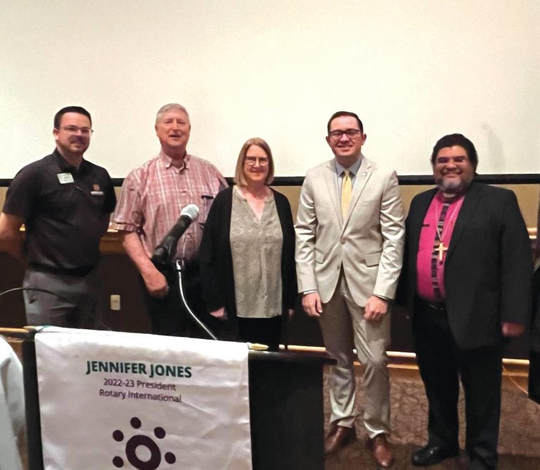 The Dodge City Rotary Club met Feb. 26 at the Boot Hill Conference Center and heard from Debbie Snapp about all the services provided by Catholic Charities of Southwest Kansas. Guests that day included Episcopal Bishop Silvestre Romero, Hunter Carson of Senator Moran’s Garden City office and Rotary Assistant District Governor Bob Obee.[PHOTO BY Jan Scoggins]