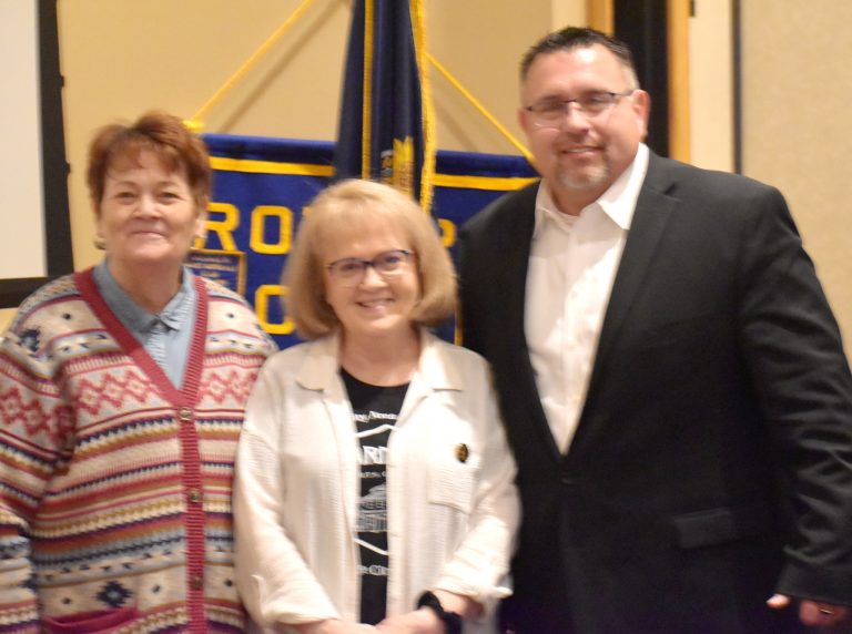 Carnegie Art Center leaders Carol Sinclair and Brenda Cornitius, together with Dodge City Rotary President Ryan Ausmus, pause for a photo at the April 7 Rotary meeting at the Boot Hill Conference Center. [PHOTO BY Whitney Hodgin/Dodge City Globe]