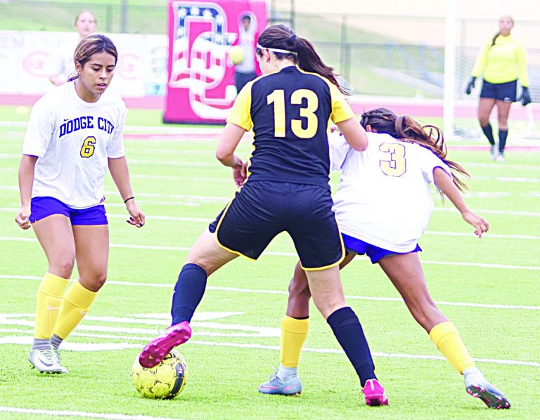 Dodge City sophomore midfielder Marcela Martinez and freshman midfielder Karen Macias compete for a ball with Cloud County freshman midfielder Yasmidt Mendoza in Wednesday's 2-1 Conquistador win. SHELTON BURCH/STAFF PHOTOGRAPHER / Dodge City Daily Globe