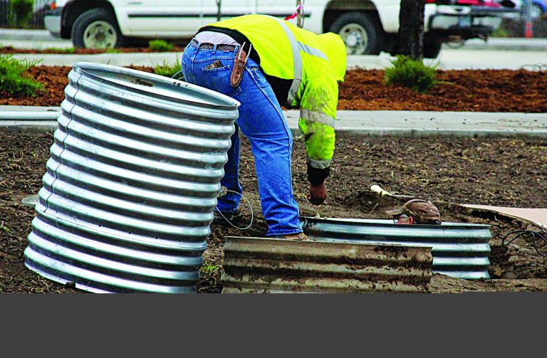 A Dodge City maintenance worker hands his co-worker, who is in a drainage culvert, something as they work on 4th Street in front of the new Long Branch Lagoon on Tuesday near Wright Park. Despite chilly temperatures, city crews were busy throughout the community. ROGER BLUHM/DODGE CITY DAILY GLOBE / Dodge City Daily Globe