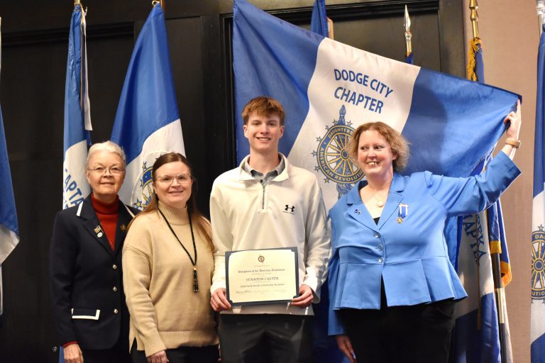 Minneola Drugs’ CNA Stanton Custer, 18, received the Judd Smith Brooks Scholarship for $1,000 April 5 at the annual conference of the Daughters of the American Revolution in Wichita. He stands with proud mom Livia Custer, grandmother Anne Merrick and Dodge City Chapter Regent Katie Schmidt. Custer plans to major in integrated physiology at K-State before returning to southwest Kansas to work as an anesthesiologist. [PHOTO BY Whitney Hodgin/Dodge City Globe]