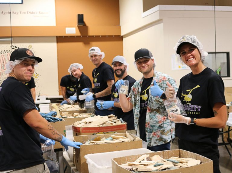 A total of 32 students, faculty and staff, from the Dodge City Community College-Arizona (DC3-Arizona) flight instructor program, participated in their first-ever Community Service Day on April 17. Beginning at the DC3-Arizona teaching location, in Chandler, Ariz., with free T-shirts, games, and purple donuts, the participants then carpooled to the Midwest Food Bank, in Gilbert, Ariz. There, the DC3-Arizona volunteers received instructions for their task, which was to assemble nearly 5,000 hygiene kits for those in need.[PHOTO BY DC3-Arizona]
