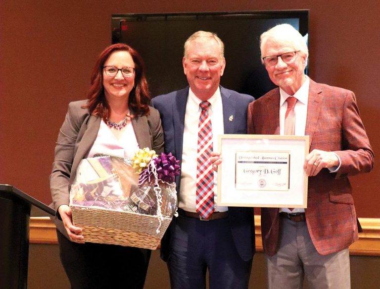 Greg Goff (right) served as the 63rd DC3 Distinguished Alumnus for the college’s graduation weekend activities on Friday, May 10, and Saturday, May 11. Above, Goff receives his Distinguished Alumnus certificate and gift basket from Christina Haselhorst, DC3 Director of Foundation and Community Relations; and Dr. Harold Nolte, DC3 President, at the Honors Banquet on Friday evening. [PHOTO BY Lance Ziesch]