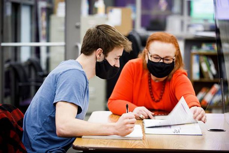 DCCC Academic Coach, Kathleen Keller (above, right), works with DCCC freshman Austin Mee, on Feb. 22, at the Student Achievement and Resources Center, which is located on the second floor of the Science & Math building. / Gavin Peters, DCCC