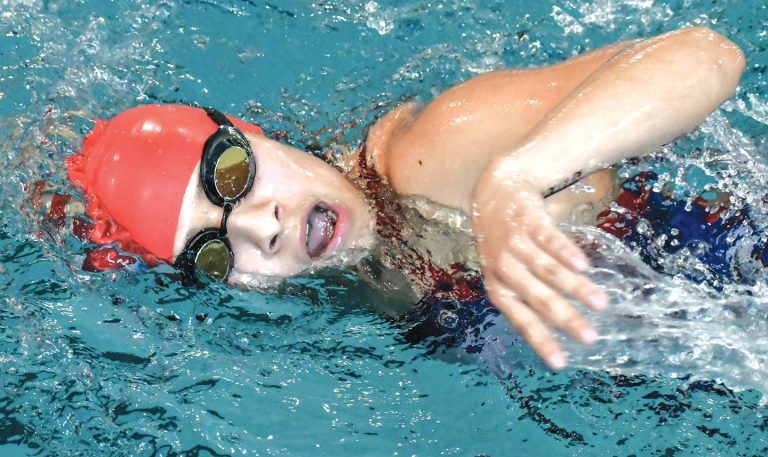 Dodge City High School’s Yareslie Alonzo takes a breath as she makes a stroke Thursday in a 200-yard freestyle heat race during a Garden City High School girls’ swimming quadrangular at the Garden City Family YMCA. [PHOTO BY Brad Nading/Garden City Telegram]