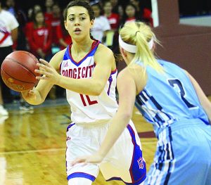 Dodge City High School senior Tia Bradshaw scoops a shot under the arm of a defender during the Red Demons' scrimmage on Tuesday night. PHOTO BY JOHN ZETMEIR/DODGE CITY DAILY GLOBE / Dodge City Daily Globe
