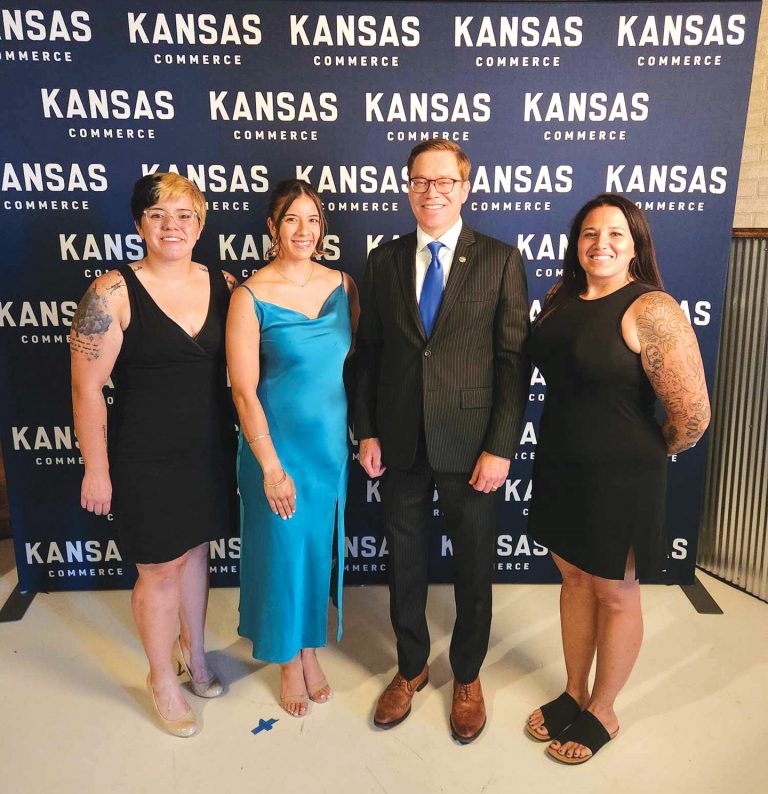 Kansas Secretary of Commerce David Toland celebrates Dodge City’s Flex Fitness 24/7 owners Stephanie Mejia, Scarlett Real and Danielle Flores at the 39th Annual Minority Enterprise Development Awards ceremony at Wild Sage Ranch in Hugoton Sept. 6.[COURTESY PHOTO]