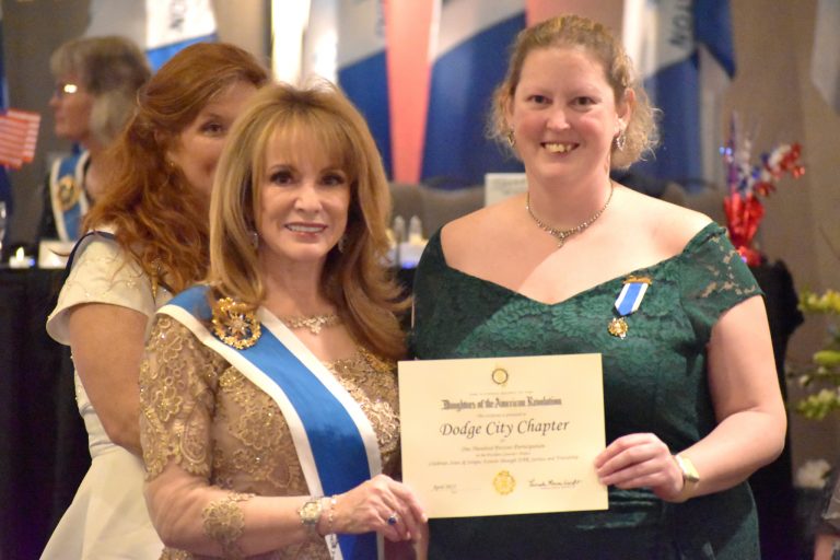 Daughters of the American Revolution President General Pamela Rouse Wright presents Regent Katie Schmidt a certificate of appreciation for the Dodge City chapter’s contribution to the president general’s project at Memorial Continental Hall in Washington, D.C. They are pictured together at the 127th Annual State Conference April 5 in the Wichita Marriott. “Liberty, when it begins to take root, is a plant of rapid growth,” George Washington.[PHOTO BY Whitney Hodgin/Dodge City Globe]