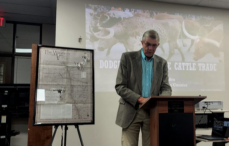 Retired Judge Dan Love introduces the man of the season Boot Hill Museum Curator Keith Wondra at the Dodge City Public Library Wint & Cheese fundraiser Saturday, Oct. 12. Wondra spoke on the significance of the Western cattle trail to this region.[PHOTO BY Whitney Hodgin/Dodge City Globe]