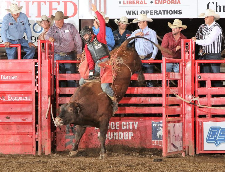 Dustin Boquet rides Frontier Rodeo’s Gladiator’s Hammer for 91.5 points during Sunday’s championship round of the Dodge City Roundup Rodeo to win the bull riding title. / David Seymore