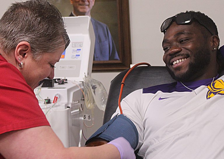 Steward Bortey gets his arm prepped for donation by Keri Howard of the American Red Cross during the group's blood drive on the camp of Dodge City Community College Wednesday. / Dodge City Daily Globe