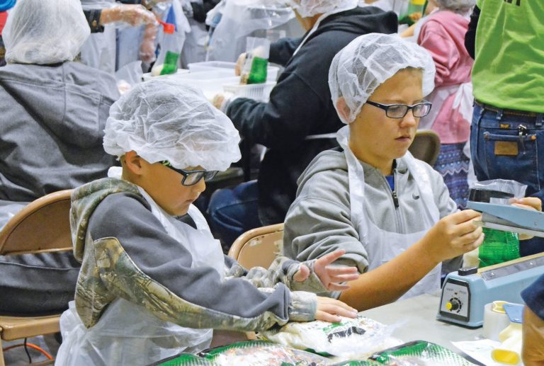 All ages volunteer at the Numana Packing Event at the civic center on Saturday. More than $17,000 was raised for the annual "Feed the Hungry" event. PHOTO BY GLORIA TUCKER/DODGE CITY DAILY GLOBE / Dodge City Daily Globe