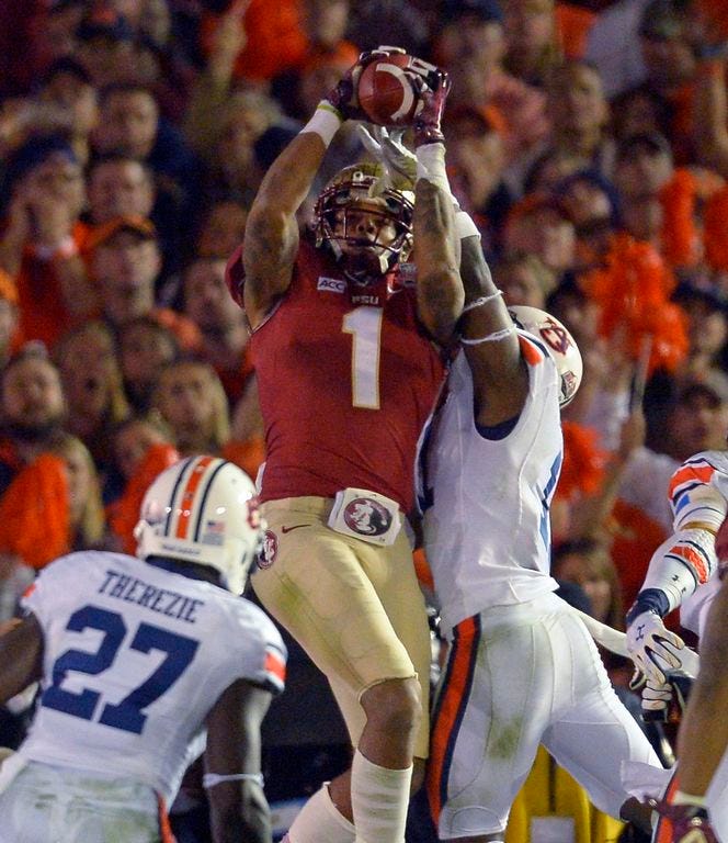 Florida State's Kelvin Benjamin catches a touchdown pass during the second half of the NCAA BCS National Championship college football game against Auburn Monday, Jan. 6, 2014, in Pasadena, Calif. (AP Photo/Mark J. Terrill) / Dodge City Daily Globe