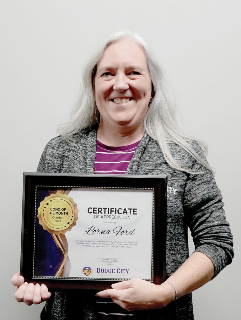 On Tuesday, Oct. 22, Lorna Ford, Early Childhood Coordinator, was honored as October’s Conq of the Month for her dedication and contribution to Dodge City Community College (DC3). At a come-and-go reception, hosted by the Celebrating Excellence at DC3 Committee, Ford was awarded a certificate of appreciation and $50 in Dodge City Area Chamber of Commerce bucks.[PHOTO BY Alba Gutierrez-Ortiz]