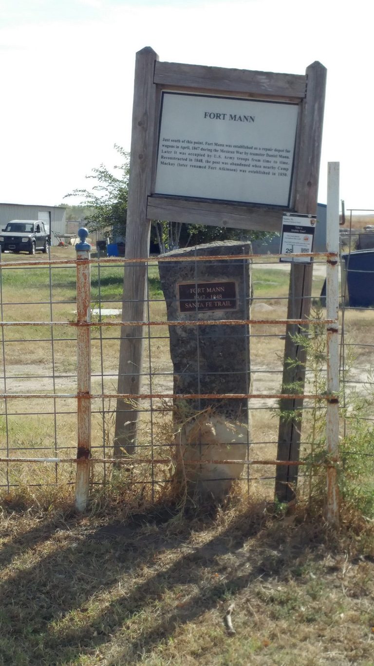 The limestone marker, plaque and storyboard about Fort Mann is located on the west edge of Dodge City on the south side of Kettle Way about three-quarters of a mile from the end of the street. / Provided By Santa Fe Trail Association