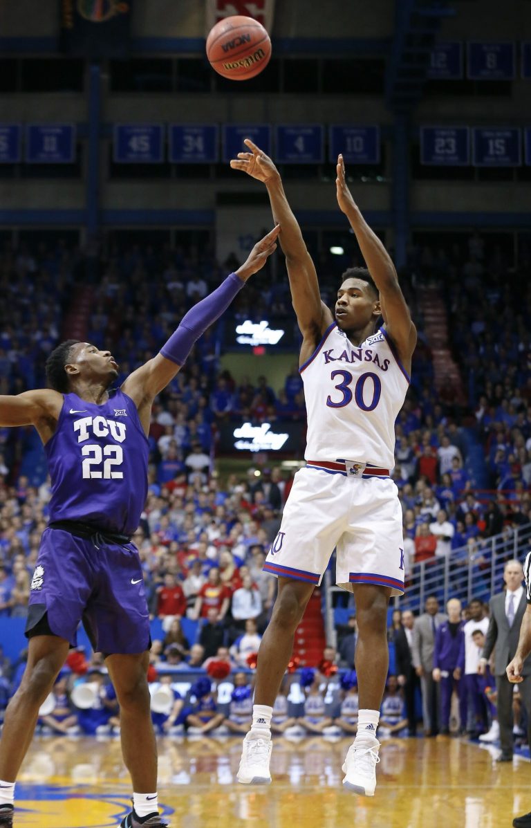 Freshman guard Ochai Agbaji attempts and converts a 3-pointer during the second half of Kansas basketball's 77-68 victory over No. 25 TCU on Wednesday night at Allen Fieldhouse. Agbaji finished with seven points in his collegiate debut. [Chris Neal/The Capital-Journal] / Dodge City Daily Globe