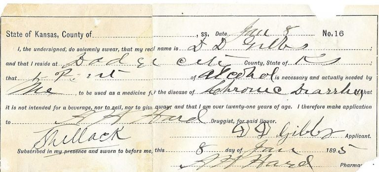 Home News Historically Speaking: Prohibition in Dodge City Historically Speaking: Prohibition in Dodge CityFebruary 15, 2021News In the 1880s in Dodge City, prescriptions such as this were written for alcohol. / SUBMITTED PHOTO By Kathie Bell, Special to the Globe On Feb. 19, 1881, Kansas was the first State in the Union to prohibit this activity, but the… Login to continue reading Login Sign up for complimentary access Sign Up Now Close Previous Post Online program features horticulture experts from across state Next Post Outdoors: Mange, Mange Go Away Featured Local Savings -