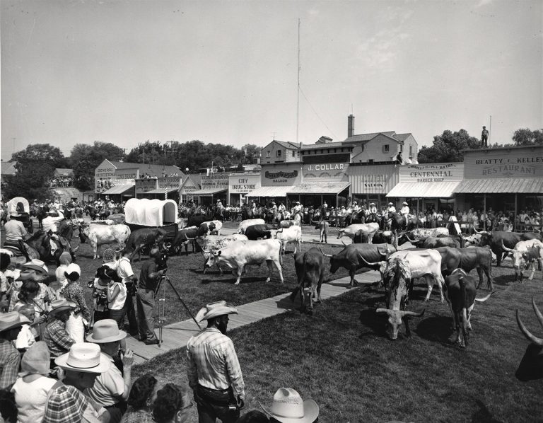 Photo-Caption:Longhorn cattle in front of the Front Street Replica at Boot Hill Museum at the end of the Texas Longhorn Centennial Trail Drive in 1966.