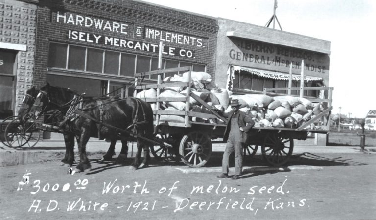 Farmer Tom White’s great grandfather, A.D. White, prepares to send off his sacks of watermelon seed in 1921. All of that seed would be worth roughly $50,000 today.[COURTESY PHOTO Kearny County Museum]