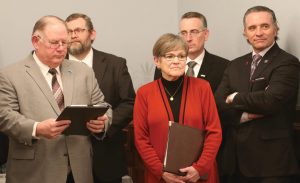 Gov. Laura Kelly speaking at her inauguration in 2023. This year, she’s presenting lawmakers with a plan to overhaul taxes.[PHOTO BY Stephen Koranda/Kansas News Service]