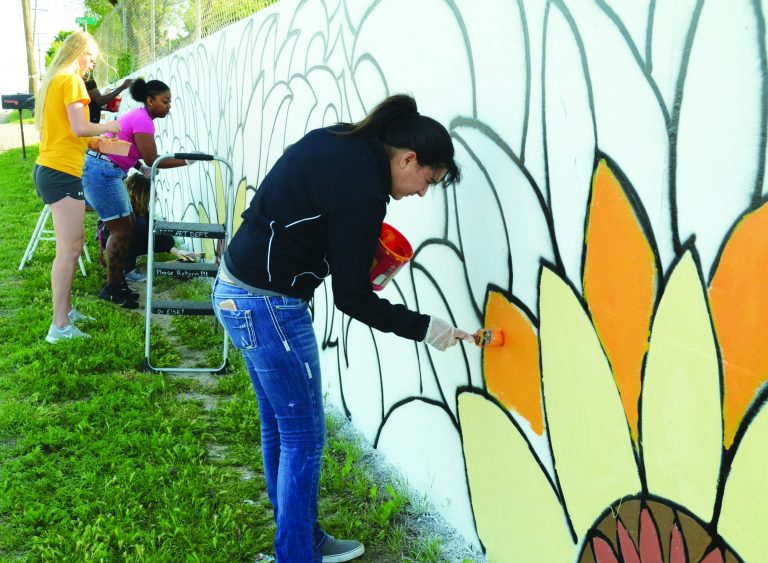 Tiara Diaz paints a flower on the wall mural on the 700 block of North 14th Ave. on Friday. Dodge City Community College Fine Arts Department staff and students created the mural as part of the Keep Dodge City Beautiful program. PHOTO BY GLORIA TUCKER/DODGE CITY DAILY GLOBE / Dodge City Daily Globe