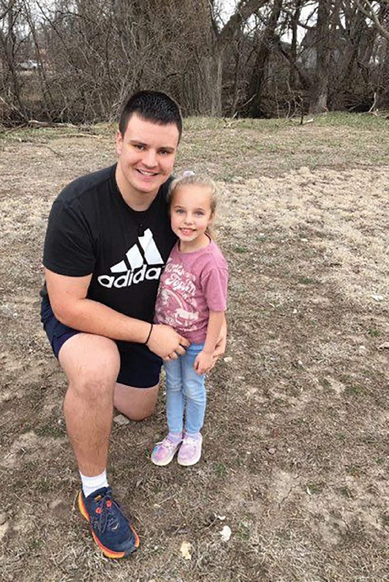 Zachary Kraft, a 6-foot-3 senior lineman on the Coyote football team works at Kinsley Food Pride and has become a larger-than-life hero to a little customer who comes in with her dad to shop.[COURTESY PHOTO]