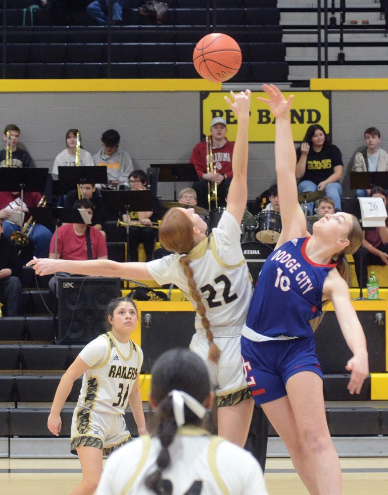 Dodge City sophomore Piper Mellinger takes the opening tip against Newton freshman Taije Botterweck during the seventh-place game of the 48th Newton Invitational at Ravenscroft Gym.[PHOTO BY Mark Schnabel/Newton Kansan]
