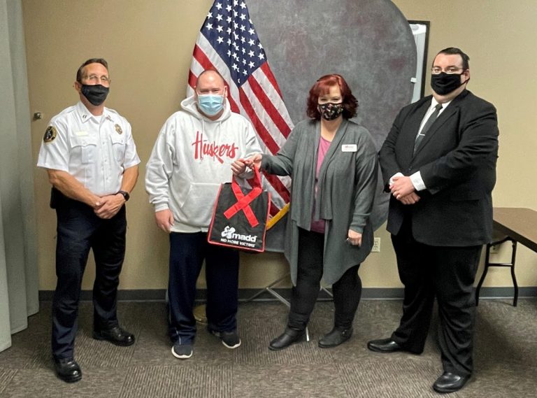 Dodge City police Capt. Shannon McGee; Susan Ratzlaff, MADD; and James Crux, assistant Ford County attorney, present police Sgt. Thad Brown special recognition for the Holiday Drive for Victims, remembering those killed or injured by drunk driving. / SUBMITTED