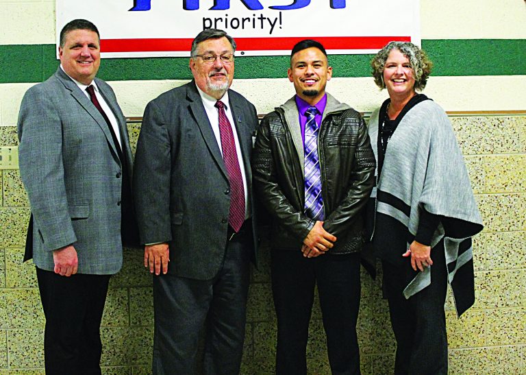 Assistant Superintendent of Secondary Education Dr. Glenn Fortmayer, Superintendent Alan Cunningham, Gilbert Still and Assistant Superintendent of Elementary Education Tami Knedler are shown shortly after Still received USD 443's Elementary Teacher of the Year nomination.. COURTESY PHOTO / Dodge City Daily Globe