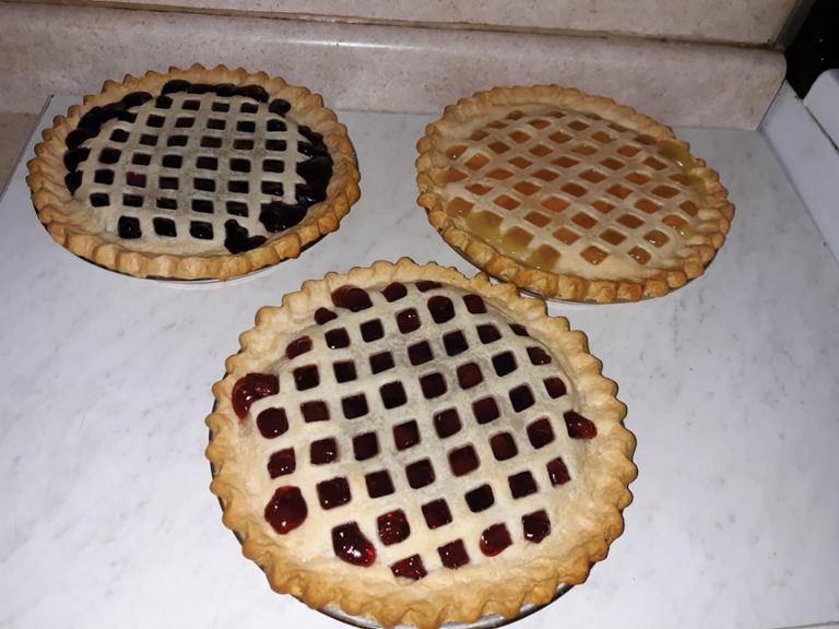 Lovina made these cherry, blueberry, and peach pies to take to Sister Emma’s house, where the Thanksgiving table was set for 42.[COURTESY PHOTO]