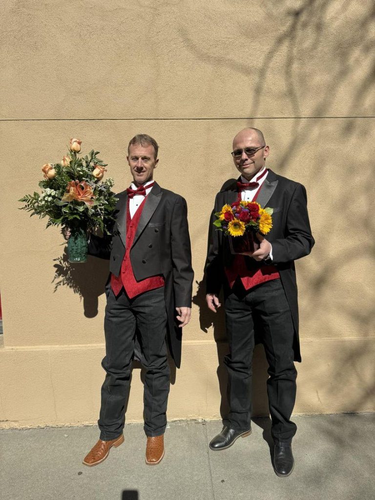 Flowers by Irene’s “men in black” Mike Weber and Kyle Krout look sharp, yet sweet, in black and red tuxedos as they hand deliver flowers for Valentine’s Day. Marilyn and Duane Weber started the family tradition when they owned the flower shop, located inside Eryn’s Downtown Center in downtown Dodge City.[COURTESY PHOTO]