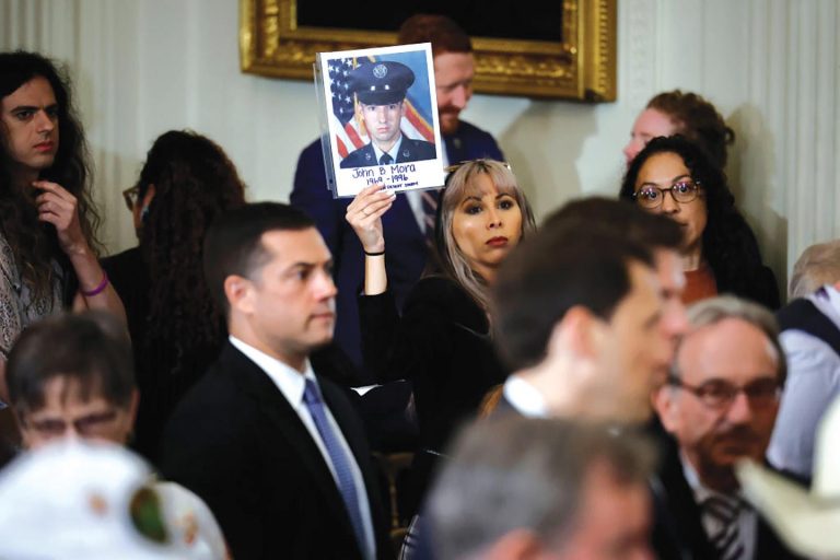 Family members hold up images of deceased loved ones during the ceremony where U.S. President Joe Biden signed the PACT Act in the East Room of the White House on Aug. 10, 2022 in Washington, D.C. [Chip Somodevilla/Getty Images]