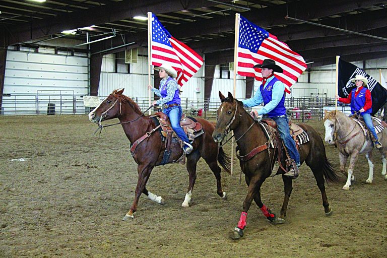 Cheyenne Miller on Peaches and Andrew Linvelle on Hank led the Grand Entry opening Thursday morning at the 3i SHOW. Dodge City Community College rodeo team members carried American and armed forces flags, as well as a POW flag at the Western State Bank Exposition Center. PHOTO BY JENNIFER STULTZ/DODGE CITY DAILY GLOBE / Dodge City Daily Globe
