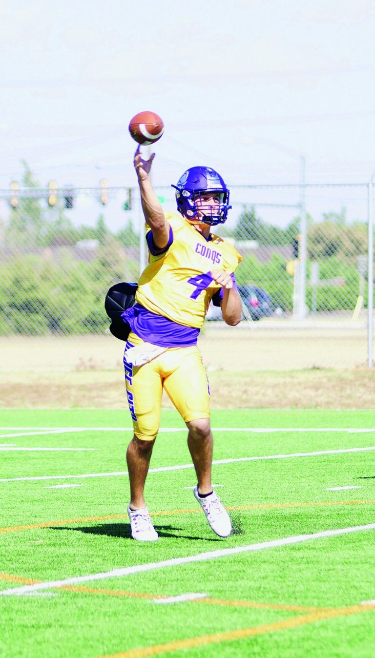 Dodge City Conquistadors sophomore quarterback Caden Walters throws a pass in practice this week. SHELTON BURCH/STAFF PHOTOGRAPHER / Dodge City Daily Globe