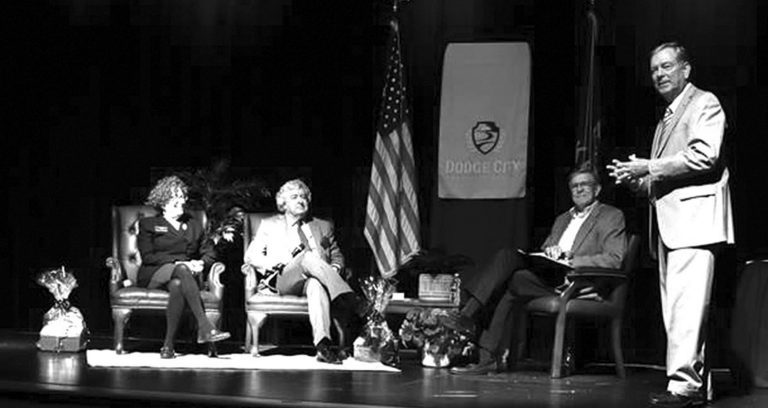 Dodge City Community College President, Harold Nolte (right), welcomes Kansas Supreme Court Justices, Melissa Standridge (left) and Daniel Biles (second from left) to the DCCC campus on Thursday, April 7. At a question-and-answer session in the DCCC Little Theatre, the justices discussed topics relating to the state’s highest court. Also pictured is discussion moderator Daniel Love. [PHOTO BY Luke Fay/Dodge City Community College]