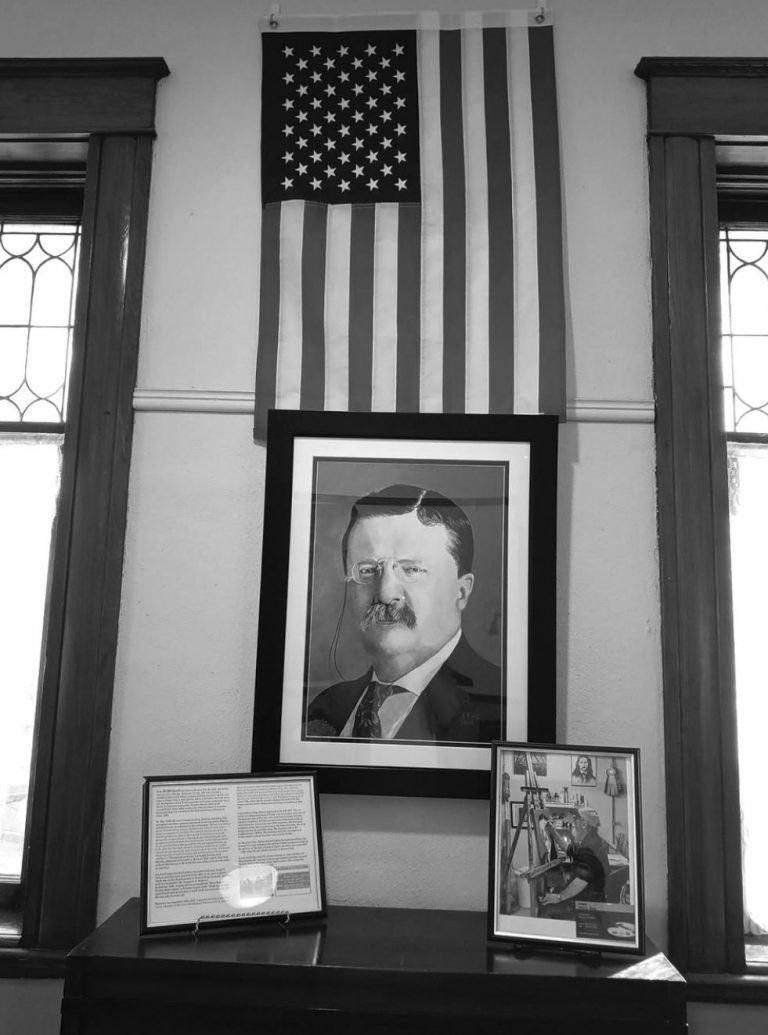 A picture-perfect painting of President Theodore Roosevelt is handsome where it hangs below an American flag on the east wall of the Carnegie Art Center, 701 N. 2nd Ave.