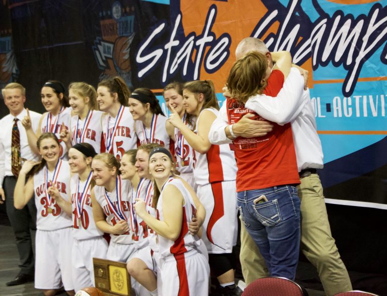 Quinter head girls basketball coach Matt Havlas and his wife embrace while the team poses for photos minutes after winning Quinter High School's first ever girls state basketball championship. SHELTON BURCH/STAFF PHOTOGRAPHER / Dodge City Daily Globe