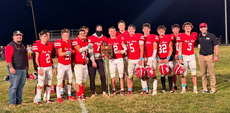 The Bucklin Red Aces pose for a photo Oct. 25 after defeating Minneola 50-30 to claim there first district title since 2001. [COURTESY PHOTO Bucklin High School]