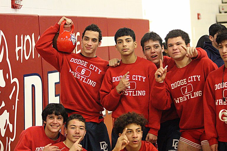 Red Demons wrestlers pose with "The Bell" after winning the first ever "Battle for the Bell" Thursday night. SHELTON BURCH/STAFF PHOTOGRAPHER / Dodge City Daily Globe