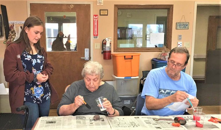MacKenzie Swan brings the Kindness Rocks Project to SunPorch of Dodge City elders Joyce Rand and Kent Kimbrel, and others who live at the long-term-care residence. The painted rocks have been placed around town. Anyone who finds a rock may keep it or replace it to share kindness with others. FOR THE DAILY GLOBE / Dodge City Daily Globe