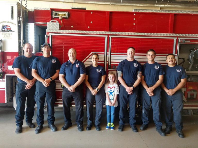 Left to right: Engineer Matt Peterson, Firefighter Matt Veeder, Fire Chief Ken Spencer, Firefighter Summer Rhodes, "Fire Explorer Day" winner Remington Culver, Firefighter Jacob Hardiman, Engineer Brad Hines, and Firefighter Luiz Diaz, pose in front of Engine 418 at Station 1 on 201 Soule Street. / SUBMITTED PHOTO