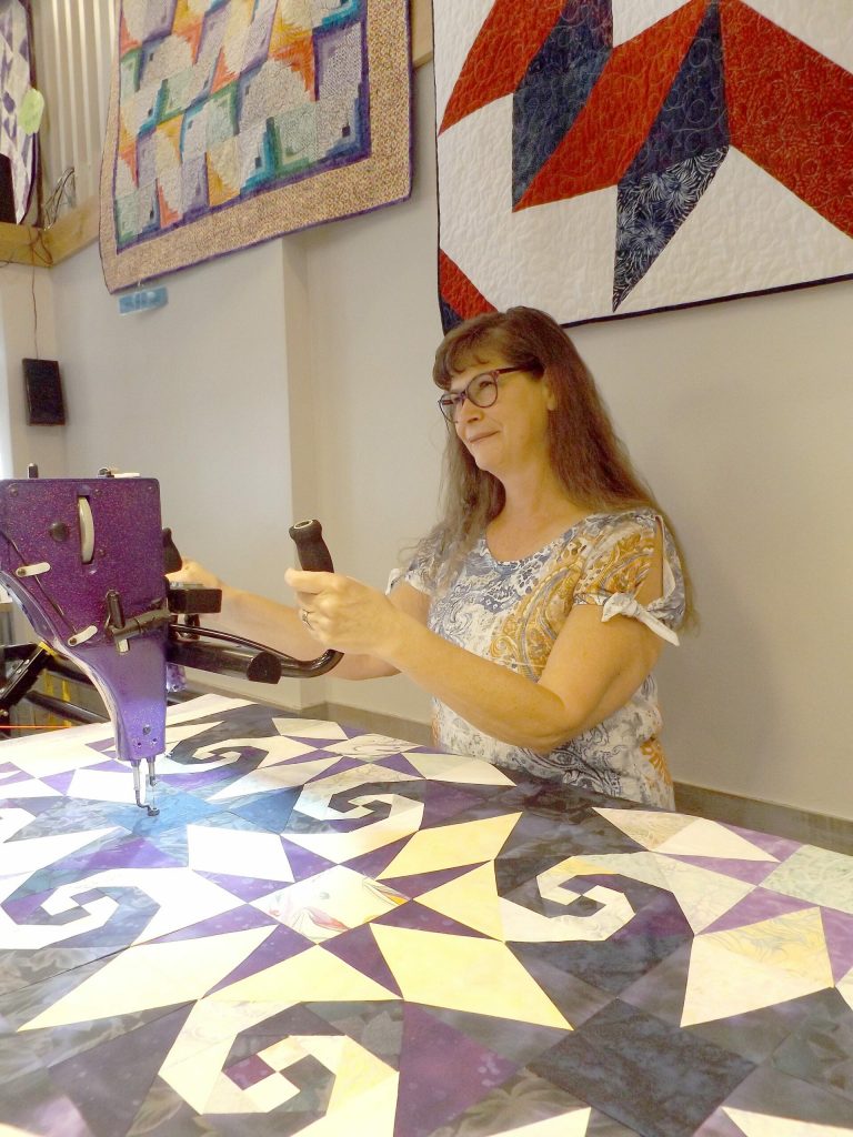 Using her long arm sewing machine, Joyce Muhlenbruch quilts a custom design on a blanket for a customer at her new business, Birds of a Feather Quilt Shop. [WHITNEY CARTER/DODGE CITY DAILY GLOBE] / Dodge City Daily Globe