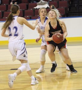 Ingalls sophomore Regan Ast (10) takes a quick couple steps toward the basket in the Bulldogs' Jan. 24, 2019 SPIAA League Basketball Tournament game against the Pawnee Heights Tigers. SHELTON BURCH/SPORTS EDITOR / Dodge City Daily Globe