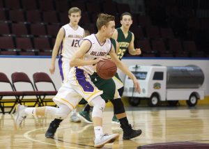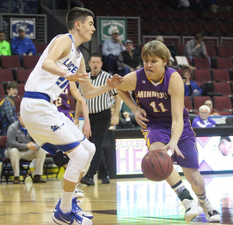 Minneola sophomore Austin Schaffer (11) attempts to dribble around a defender in the Wildcats' Jan. 25, 2019 SPIAA League Basketball Tournament consolation game against the Spearville Lancers. SHELTON BURCH/SPORTS EDITOR / Dodge City Daily Globe