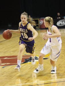 South Gray sophomore Megan Tarn (3) dribbles the ball near midcourt in the Rebels' Jan. 24, 2019 SPIAA League Basketball Tournament Semifinal game against the Kiowa County Mavericks. SHELTON BURCH/DODGE CITY DAILY GLOBE / Dodge City Daily Globe